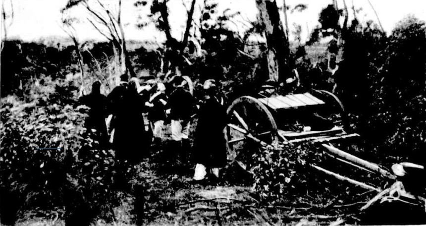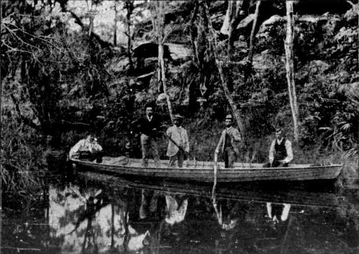 About 3 p.m. they saw that five young fellows in a boat were in trouble, having lost their rowlocks, and after some talk it was arranged that they should strike camp, and all proceed down the lake for home in one boat, towing the other. Meanwhile the lake had risen in flood. Crossing under the bridge at the entrance to Deep Creek, the party of eight all had to lie in the boat, in order to pass under, and even then Miss Cox received a violent blow on the head which almost stunned her. No sooner had the boat passed under the bridge than it was in very rough water and, getting broadside on to the waves, filled and throw the party into a deep part of the lake. Miss Cavanagh could not swim, but the other members of the party assisted her, and after a tough struggle for about 20 minutes they all got into a depth of Water, in which they could stand up. At this time it was nearly, dark, and the girls returned to the cave on foot, having rescued some of their. things, but lost their blankets, a lamp, a rug, some shoes, and their parcels of food.