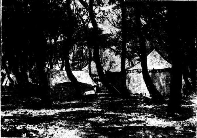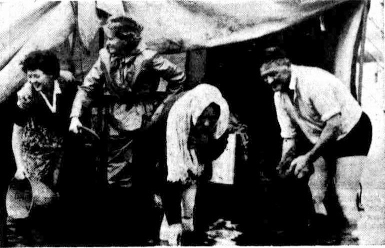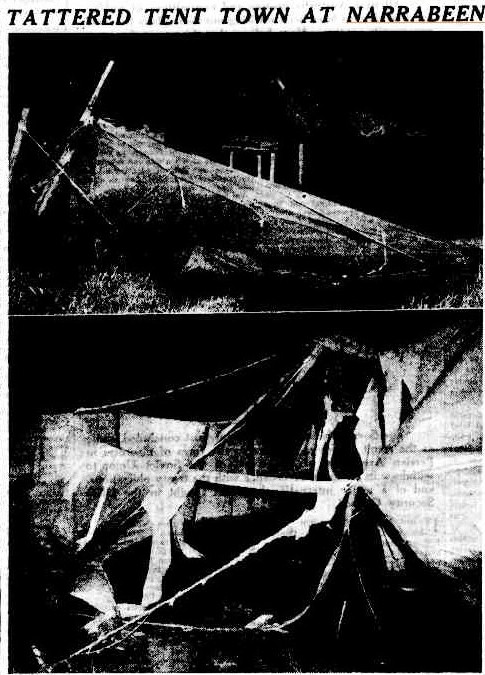 PANIC IN CAMPING AREA. The storm struck the Narrabeen camping area with terrific force. Within 30 seconds the wind had destroyed eight tents and much of the campers' gear. One of the campers, Mrs. J. McDonald, said most of her household goods in her tent were completely destroyed. A steel ice chest was flattened like a board.