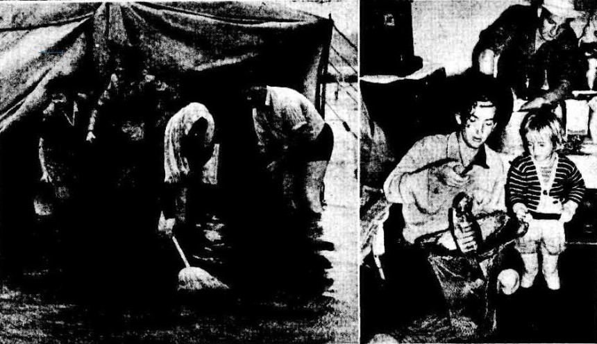 SYDNEY BATTERED BY WIND AND RAIN. RIGHT: After her tent was blown down at the Narrabeen camping area, Mrs. F. Osborne (right) and her four young children sheltered in a tent occupied by Mrs. J. Shepherd and her family. Eleven people are now living in the tent. SYDNEY BATTERED BY WIND AND RAIN. (1951, June 9). The Sydney Morning Herald (NSW : 1842 - 1954), p. 3. Retrieved from http://nla.gov.au/nla.news-article18222620