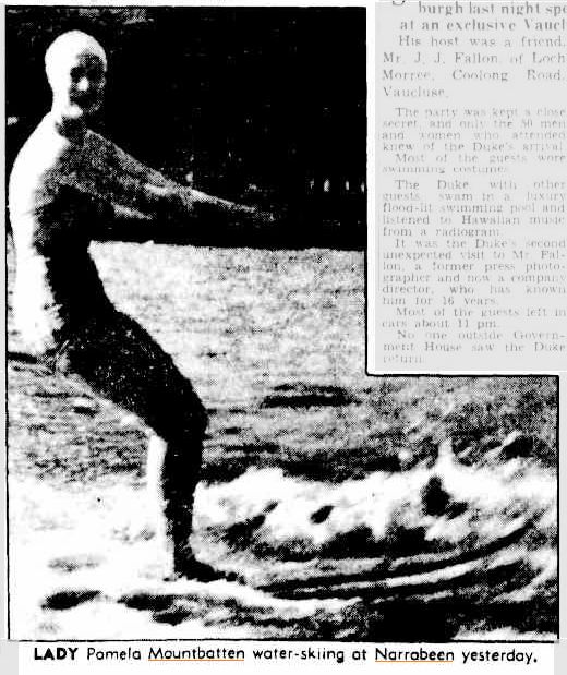 Lady Alice Egerton, meanwhile, was in a party of two Royal cars that went to Palm Beach. With her were the Queens secretary, Sir Michael Ademe, her assistant secretary, Colonel Martin Charter is, the Minister in charge of the Royal tour, Mr. Eric Harrison, and the Commonwealth Director, Lieutenant-Colonel F. H.Berryman. Crowds cheered, waved, and tooted motor horns as the cars passed them on the way to Palm Beach. When they saw the Queen was not in the cars they also decided to wait for the Queen. A rumour spread that the Queen's car would come next. At Palm Beach the party went to the home of Mr.Sam Walder. All the party surfed later except Lady Alice, who sat on the beach. Mr. Walder's home is near the home of Mr. J. Carroll, where it was rumoured last week that the Queen and Duke would rest. Ladies-in-waiting Confuse Crowds. (1954, February 8 - Monday). The Sydney Morning Herald (NSW : 1842 - 1954), p. 4. Retrieved from http://nla.gov.au/nla.news-article18408639