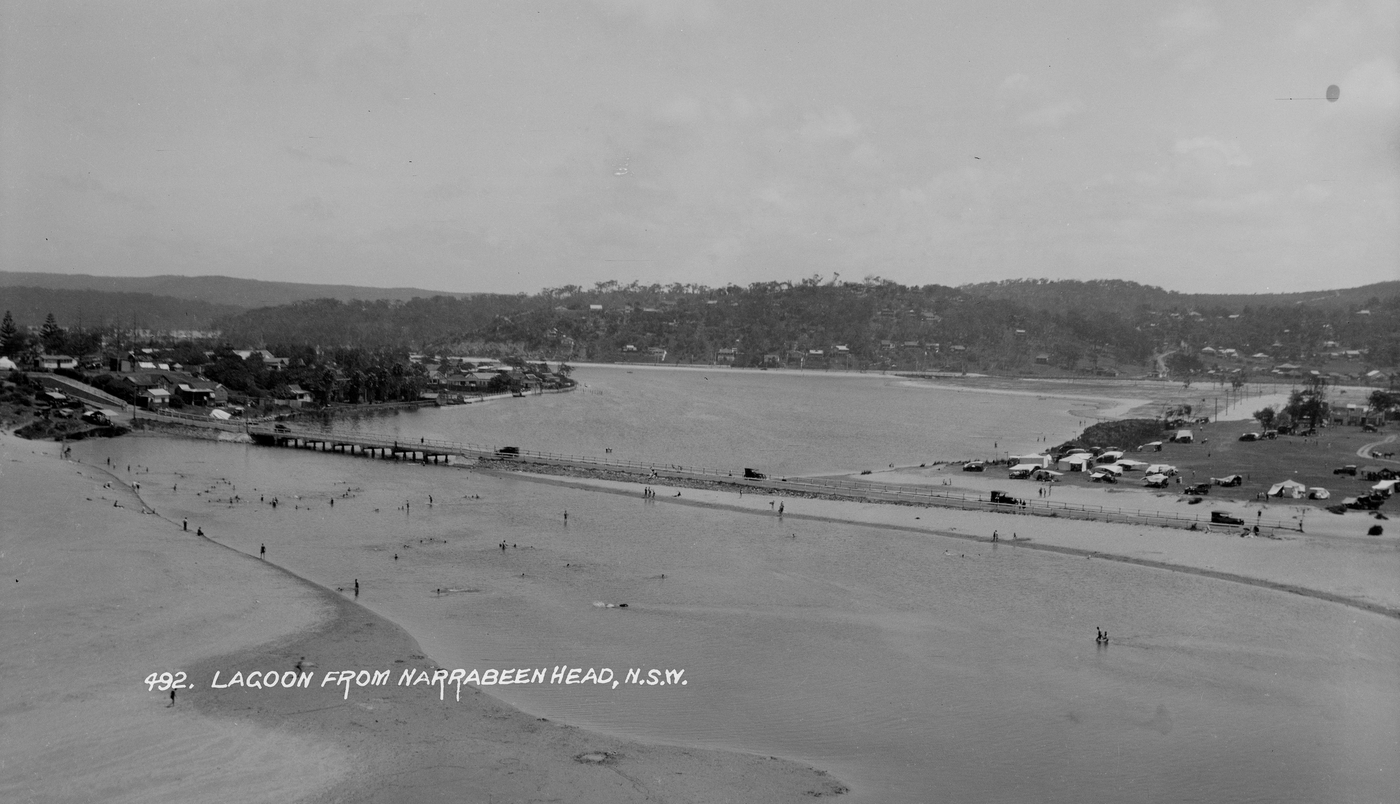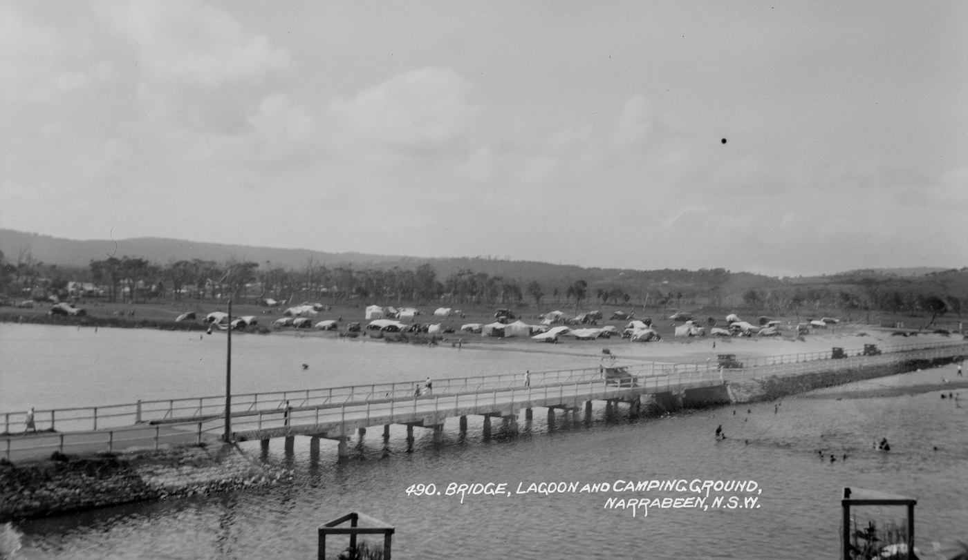 Samuel Wood - postcard photonegatives of Narrabeen, ca. 1928. Images No.: a1470095 and Bridge, lagoon and camping ground, Image No.: a1470093, courtesy State Library of NSW.