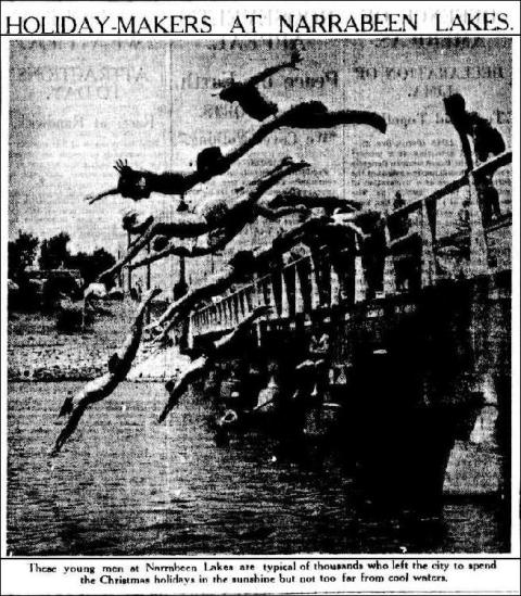 HOLIDAY-MAKERS AT NARRABEEN LAKES. These young men at