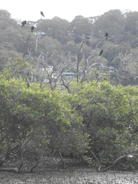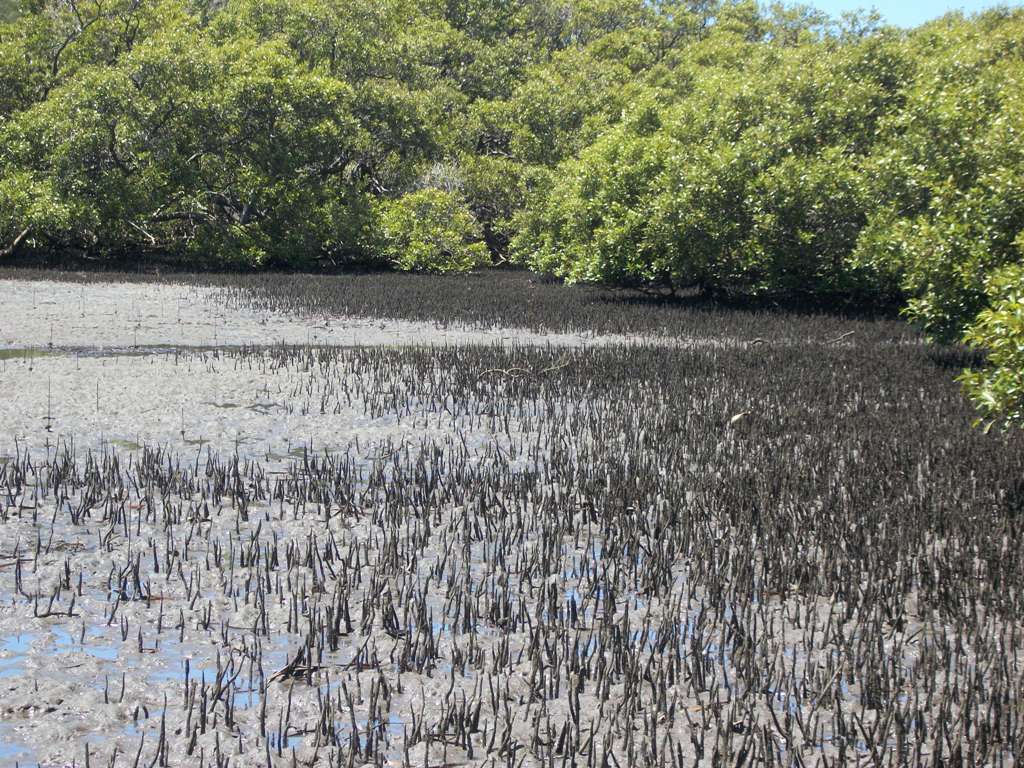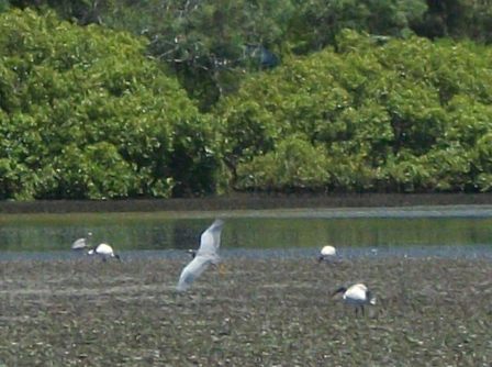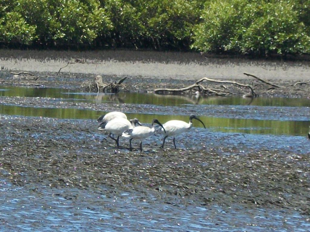 Below: Sacred Ibis walking over Seagrass at low tide, Under that – intertidal mud and sand flats with an edge of Sea Rush - Juncus kraussii leading up to the shore and the She Oaks, Under that Pneumatophores (aerial breathing roots) of the Grey Mangrove.