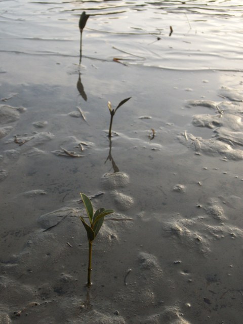 Top right – Nobby Club Rush.- Ficinia nodosa, Under that is Common Rush - Junus usitatus, under that is seedlings of Grey Mangrove – Avicennia marina, Under that: Seagrasses – this one is the one that grows in the more shallow area – Zostera sp. Last; Grey Mangrove Seedlings growing (DFE picture).
