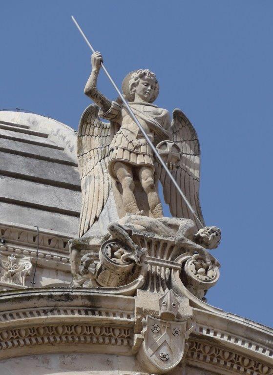 Winged angel with spear - on the roof above the side entrance.