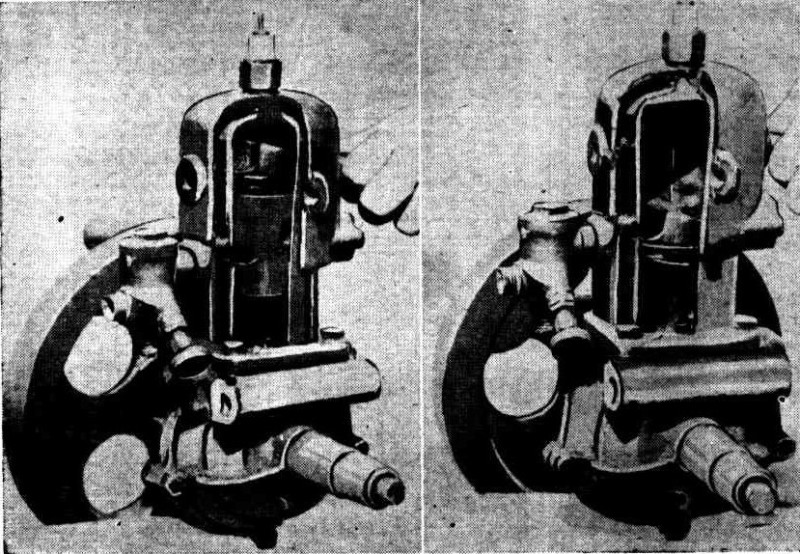 B.-The piston at the bottom of its stroke has uncovered, first, the exhaust; port (not seen) on the right, and then the transfer- port, on the left, which allows the new mixture, now compressed in the crankcase, or transferred to the cylinder. Note the shape of the top of the piston, which deflects the incoming gas to the top of cylinder, and prevents loss through the still-open exhaust port. In some engines the intake is controlled by a separate port. These are called three-port engines (the Chapman Pup is such), but In this type, known as the two-port, a light valve is necessary in the carburetor to prevent blow-back at the moment of transfer. HAL. McKAIL, Perth. TWO-STROKE ENGINES. (1937, December 16). Western Mail(Perth, WA : 1885 - 1954), p. 50. Retrieved from http://nla.gov.au/nla.news-article37844350