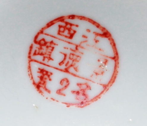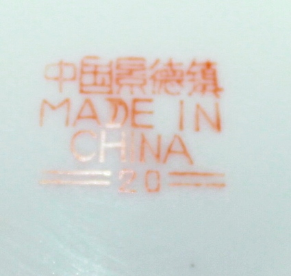 In around 1953 to 54, almost all the factories in Jiangxi were merged into larger units, each made up by ten to fifteen previously independent factories. From this time factory numbers such as =9= came to be used. The use of alphabetic characters and numbers in the marks also seems to have started around this time. Long time porcelain merchant in Hong Kong, Mr. Kung, was when asked by Simon Ng on this, of the opinion that =09= and similar, were names assigned to each of the factories in Jingdezhen by the Communist Party.