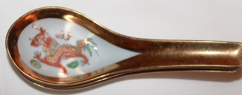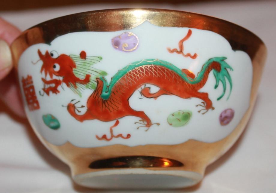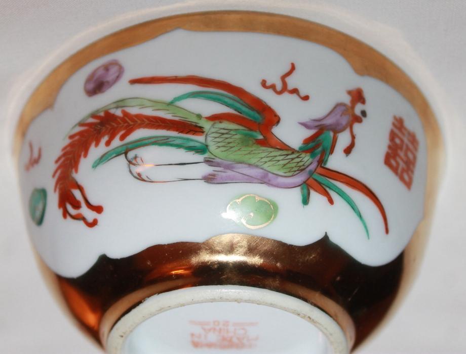 Bowls, such as those shown in the photographs here, with dragons, phoenixes, gourds, and characters, are for happiness. This one has brought much happiness to our family as it can be traced to a certain engagement, on a certain evening dinner, and bought from the owner of that restaurant on that evening - so we can state emphatically it is at least 55 years old.