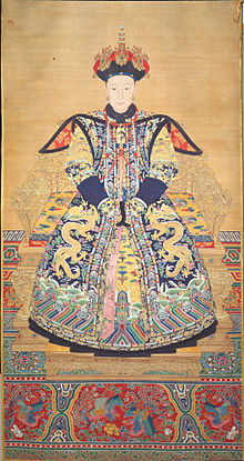 From the period of the Jiajing Emperor (1522–66) on, a pair of phoenixes was differentiated by the tail feathers of the two birds, typically together forming a closed circle pattern—the male identified by five long serrated tail feathers or "filaments" (five being an odd, masculine, or yang number) and the female by what sometimes appears to be one but is in fact usually two curling or tendrilled tail feathers (two being an even, feminine, or yin number). It was during this period, the fenghuang was used as a symbol representing the direction south. This was portrayed through a male and female facing each other. Their feathers were of the five fundamental colors: black, white, red, green, and yellow. These colors are said to represent Confucius' five virtues: