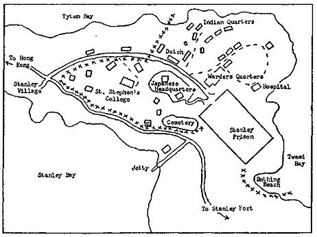 Stanley Internment Camp was a civilian internment camp in Hong Kong during World War II. Located on the Stanley peninsula, on the southern end of Hong Kong Island, it was used by the Japanese imperial forces to hold non-Chinese enemy nationals after their victory in the Battle of Hong Kong. About 2,800 men, women, and children were held at the non-segregated camp for 44 months from January 4th, 1942 to August 16th, 1945, after Japanese forces surrendered. The camp area consisted of St. Stephen's College and the grounds of Stanley Prison, excluding the prison itself.