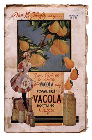 During the Depression Fowlers Kits became a household name. In 1934 Fowlers Vacola Manufacturing Co. Ltd was registered as a public company. Housewives, nationwide, were urged to bottle their own fruits and jams by 'Mrs B Thrifty', the dainty cartoon character who graced the firm's advertisements.