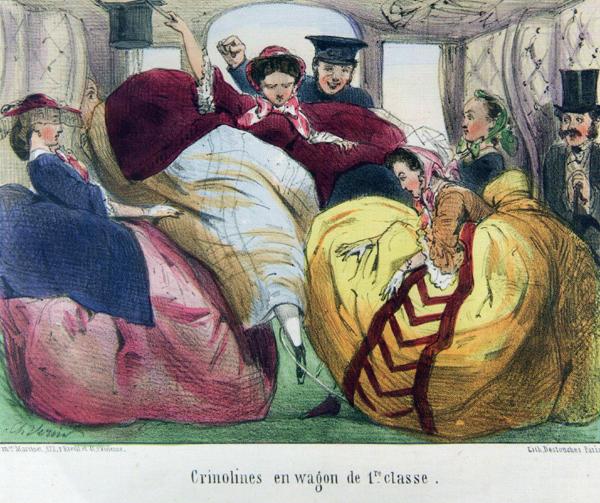 "A Splendid Spread", satire on an early inflatable (air tube) version of the crinoline by George Cruikshank, from The Comic Almanack, 1850. (Crinolines did not actually come into wide use until a few years later.) Note that the gentlemen have to use long-handled trays ("baker's peels") if the ladies are to be able to eat or drink.