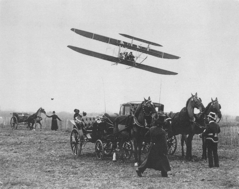 1908 -- People came from all over Europe to watch Wilbur fly. He demonstrates the Flyer for thousands of people that include heads of state, royalty, and the commanders of armies - photo courtesy Wright Brothers Aeroplane Company website