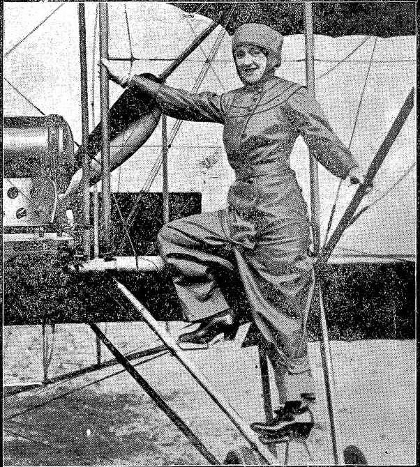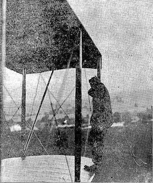 A passenger balances himself on the wings of Mr. Grahame-White's aerial ''bus' while flying at full speed. -'Central -News' Photo.
