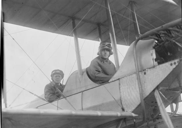 Lieutenants Harrison (left) and Petre (right) in a B.E.2 at Central Flying School, Point Cook, 1914. Courtesy Australian War Memorial, photo Number: A03916