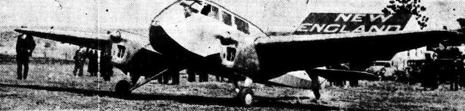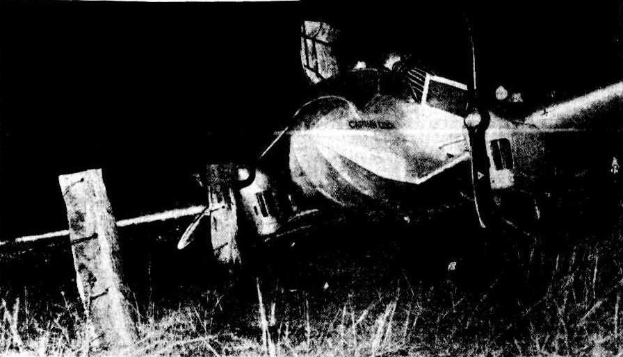 People at Beaudesert did their Best by assembling car headlights at the landing ground to help the plane to land, but. the whole affair indicates that aviation authorities should take some steps to draft out special measures which ought to be followed by small townships in such an emergency as this; -There are at present no' radio facilities in Australia for 'enabling planes to make "blind- landings," though these are being developed overseas. The method of diverting planes to other landing places in the event of fog or rain implies that the civic authorities in every town should be posted in the best method of helping planes to land, to avoid misunderstandings such as occurred last night. Cars sped for Mrs. Woods' paddock, the area usually used at Beaudesert for a landing- ground, and their lights were arranged alongside the paddock, and flares were lit. It was the manner in which these ears were arranged that confused Pilot McLaughlin and caused him to make his landing across the field at its narrowest point. For in an emergency such as this it is usual that the plane lands, over the cars supplying fight to the landing ground. He flew fairly high over the edge of the field to avoid any possibility of there being electric light or telephone wire’s bordering it, which there were, In fact, and made a perfect landing. Unfortunately, he could not get the run off the machine before he noticed ahead' of him a bank of trees on the edge of a creek which skirts the paddock. At first taking them to be rock fr-rflince he thought he was at some coastal township, he swerved the plane in order to avoid a collision. Unfortunately it was Impossible for him to have seen a fence which ran across the field near these trees. If he had had ten or fifteen feet more to spare the plane would have landed without damage. But as he swerved the starboard wing hit a wire fence post which ripped the under side of the wing practically off the fuselage. An extra touch of hard luck was the fact that the very next post the plane encountered in the fence was a big round post, which had been securely stayed. The starboard engine came up solidly against this round post and was pushed out of alignment, the propeller coming to rest against the windscreen without so much as marking it.
