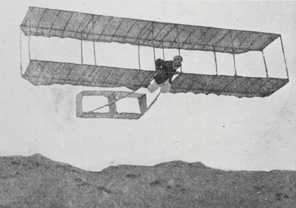 GLIDING AT NARRABEEN. SENSATIONAL INCIDENTS. AN AUSTRALIAN-BUILT MACHINE. On Sunday last Mr. George Taylor, secretary of the Aerial League, took a biplane,18ft long, with 4ft planes, and box-kite tail balance, to Narrabeen. The trials at gliding were held, Mr. Taylor himself acting as demonstrator. The scene of the flights was at Narrabeen Heads, in the presence of about one hundred visitors, the wide stretch of sand rendering any possible fall a matter of some safety. At the beginning of the experiments the wind came from the south-east at 10 miles an hour. The machine was carried to a sand knoll, and brought face on to the wind. Messrs. Schultz, Le Clerc, and Gibbons, of Narrabeen, required all their strength to hold it down. For the preliminary flights the corners were held by guide ropes 15ft in length to prevent the machine from getting out of control before the experimentor was properly tuned to automatic balancing.