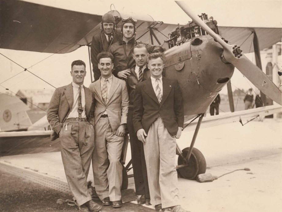 Above :Pilots watching the display at Mascot. From left to right: J. J. Larkin, L. N. Schultz, J. McLaughlin, G. W. Sawtell, T. R. Swain.