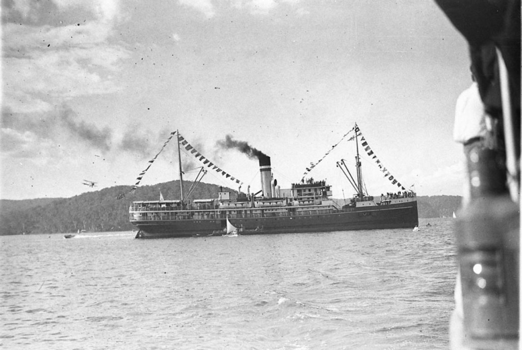 Gypsy Moth aeroplane flying near stern of Gwydir, Creator: Hood, Sam, 1872-1953 Pic No: hood_06535, Courtesy State Library of NSW.