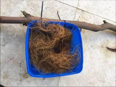 Take an empty ice-cream container, make some holes in the bottom (in case of rain) and fill it with some soft nesting materials. Attach the nest securely to the tree where the parent birds are perching. We use cable ties so that the tree isn’t harmed either.