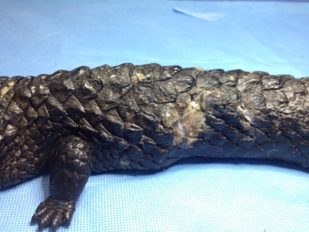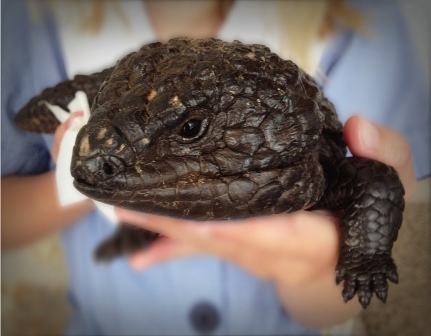 If you saw this shingleback lizard in the wild (minus the big blue bandage) you might mistake him for a giant pine-cone!