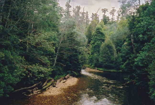 Above picture: Tasmania, Styx river in Styx valley. In the valley of the Styx grow the Eucalyptus regnans, the tallest of all flowering plants. There are also ancient tree ferns and 1,000 year old myrtles. The Eucalyptus regnans can be seen rising high above the other trees at the rear of the photo. The Eucalypts are useful for wood pulp and (in 2001) the forest was being systematically clearfelled. Photo by and courtesy of T Taylor.