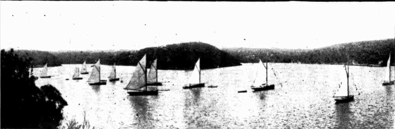Crews of two up to six or seven seemed to be the usual party, while the smallest boats were the Iris, 10 feet, aand Cutty Sark 20, Corinne 21 feet, and others, as will be seen from the list. From Beroura Creek, some 20 miles or more up, down to Pittwater, and between those places, Cowan Creek, Wagonga Creek, and the now-famous rendezvous, the Basin, boats covered in could be seen.