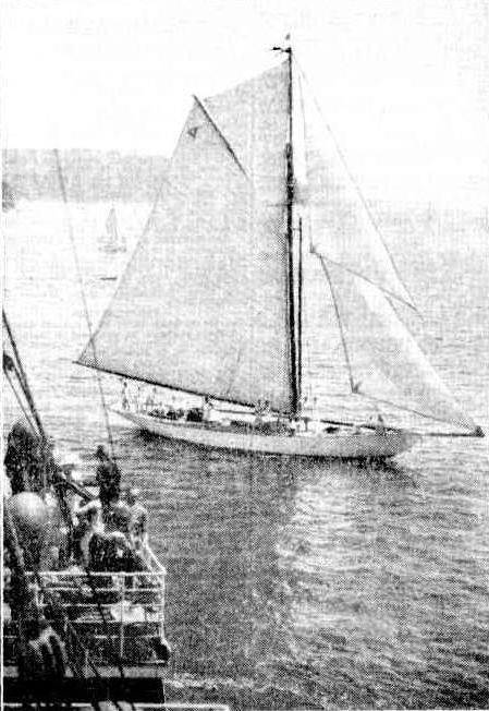 On the occasion of her last race it blew hard from the south, and, in consequence, the issue of the race was thought to lie between some of the bigger boats, the 10-tonner Sirocco being a very hot favorite, and this more especially as the yachts had to cross the Heads and the punch up from Manly was not a thing to beheld too lightly. Despite the blow they started off with all sail and topsails set for the run to the Manly mark, and soon after, looking down the harbor from Double Bay, they were lost sight of among the other regatta competitors until the return to the flagship.