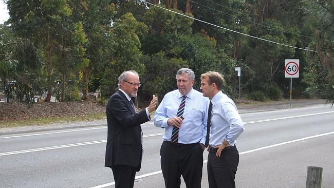 RMS infrastructure manager Geoff Cahill, Roads Minister Duncan Gay and Pittwater MP Rob Stokes at Mona Vale Rd photo by Andrew Johnston, 2013.