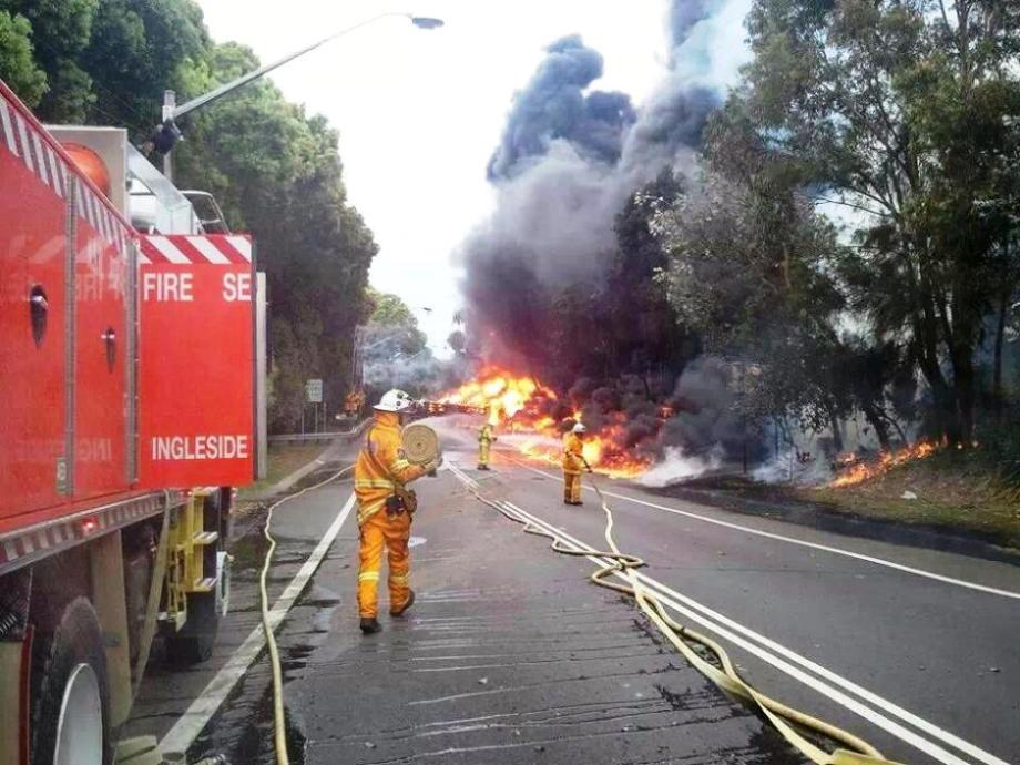 Mona Vale fuel tanker fire. Tumble Dick RFS members deploying hose. Photo courtesy Ingleside RFB.