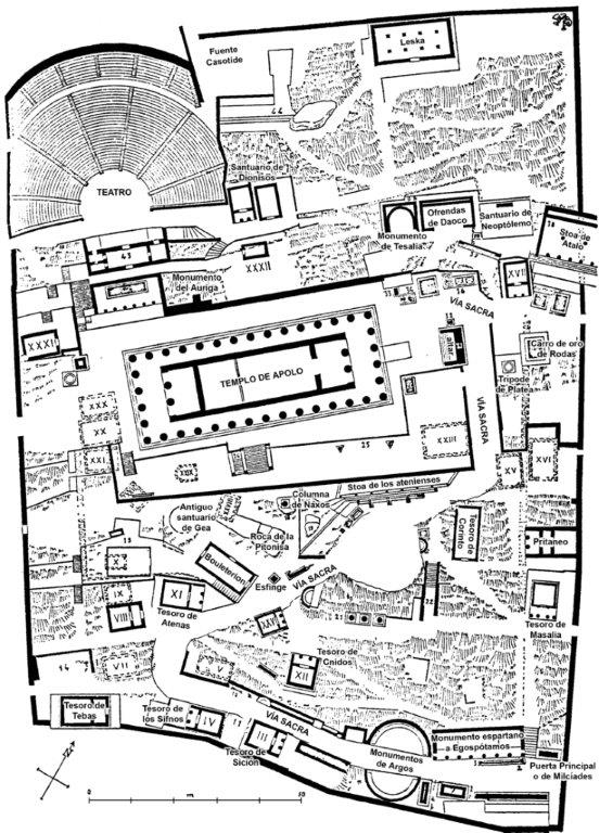 Above: Site plan of the Sanctuary of Apollo, Delphi - by P. de La Coste-Messelière : Au Musée de Delphes. Recherches sur quelques monuments archaiques et leur décor sculpté. Paris: E. de Boccard 1936