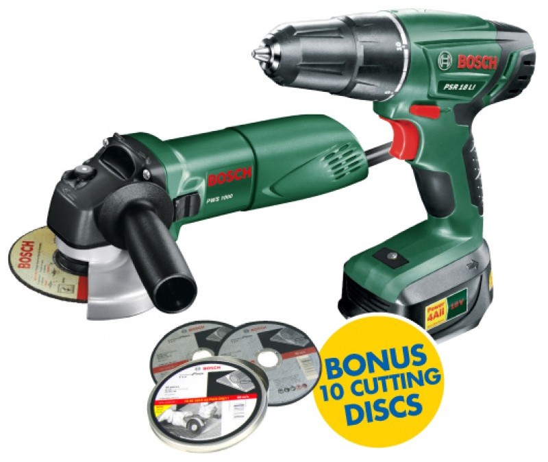 Bosch 18V Drill and 670W Angle Grinder Combo - $199.00 Drill: 15 + 1 torque settings, 10mm keyless chuck, no load speed 850rpm. Angle grinder: 100mm disc diameter, no load speed 11000rpm.