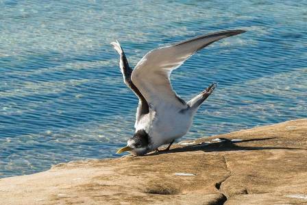 The plumage on this seabird, a Sternula albifrons, Little Tern, shows it is in its first year of life. Spotted just near a colony of Silver Gulls at Dee Why pool on Sunday its presence is also a sign of the approach of Spring. These birds migrate to Australia during the winter months. Breeding takes place during Spring and Summer from late August on. They build their nests on the ground, lining them with seaweed, seashell grit and small stones. Fish are their main diet which they catch by diving into the water. They will also eat insects and molluscs. Terns inhabit our coastal environment, including our lagoons and estuary. Silver Gulls often nest close to or in Little Tern colonies