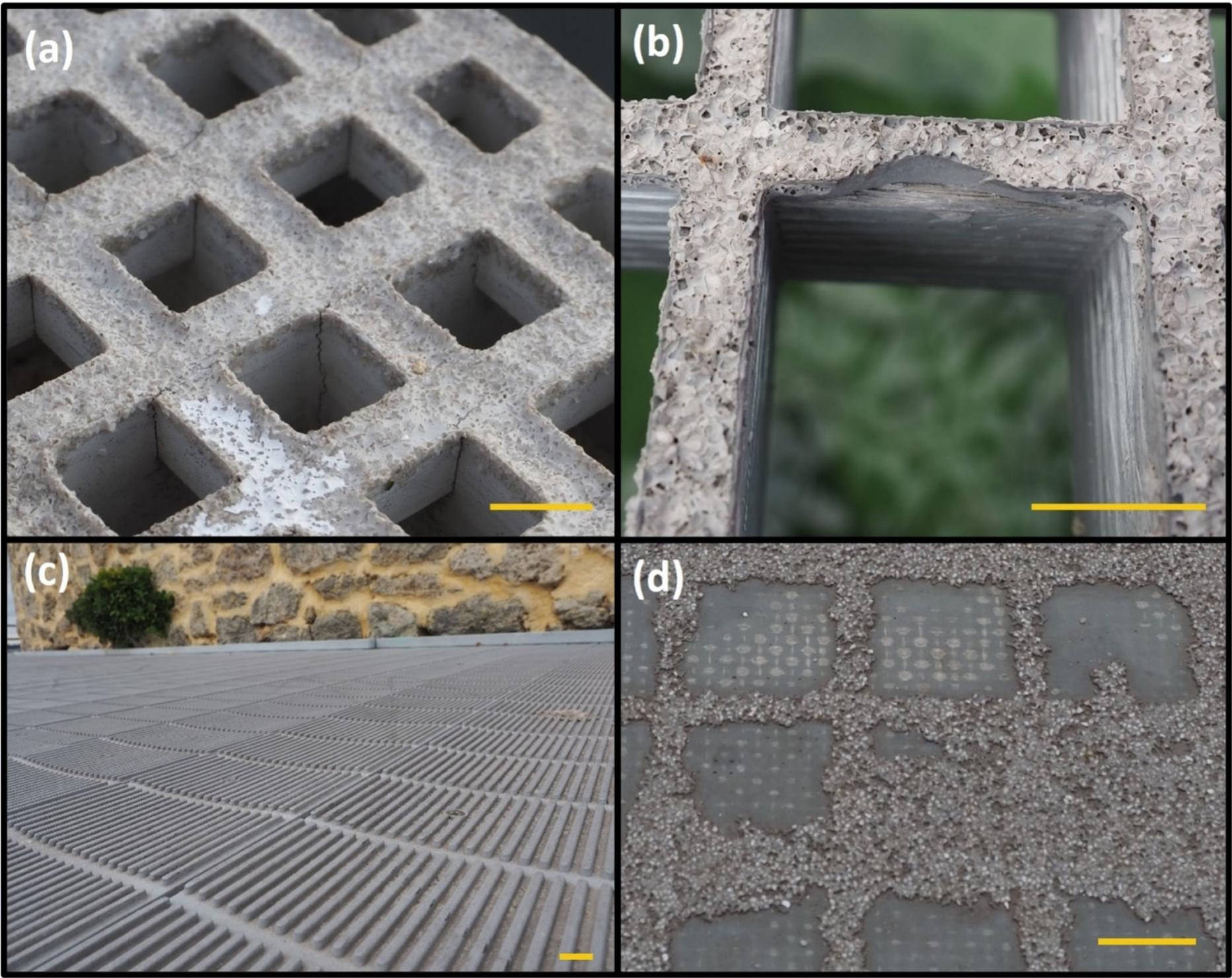 The durability of plastics, purported resistance to degradation and lower installation costs (relative to some materials) means they are often recommended over traditional materials (e.g. timber, metal and concrete) for infrastructure applications. In estuarine and coastal environments plastic is used widely for shoreline infrastructure that frequently interacts with water such as decking, walkways, pontoons, boat pen and jetty chafer posts, pile sleeves and capping, and fenders, among other uses. Shoreline infrastructure is subject to a range of degradation factors that may challenge the durability, and therefore, longevity of plastic. Laboratory testing of a commonly used plastic in shoreline infrastructure, fibre reinforced plastic (FRP), showed susceptibility to increased degradation under high ambient air temperature (>40 °C) (Wu et al., 2023), frequent wetting and drying cycles (Aiello and Ombres, 2000; Wu et al., 2023), ultraviolet (UV) radiation (Cai et al., 2018; Dong and Wu, 2019; Sasaki and Nishizaki, 2012; Zhao et al., 2017) and alkalinity (i.e. high pH rather than total alkalinity) (Bazli et al., 2016). Furthermore, abrasion and wear from foot traffic can be a significant factor in the degradation of these structures (Sabry et al., 2022; Talib et al., 2021), with the degree of severity depending on the polymer type (including fibre reinforcement), and location of infrastructure (e.g. sandy shorelines). The ongoing use of plastic in shoreline infrastructure may represent a significant source of contamination to the environment and a legacy issue for decades to come, yet there is limited understanding of the degradation and potential shedding of plastic from these structures.