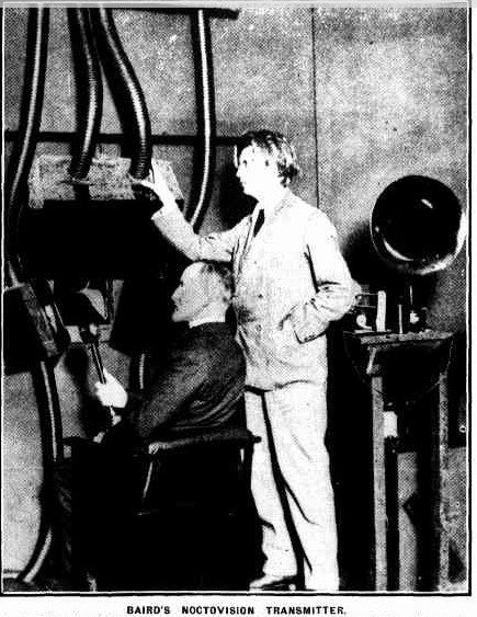 BAIRD'S NOCTOVISION TRANSMITTER. In television the subject sits with a brilliant light on his face. In noctovision the apparatus and the subject are in total darkness, and the transmission through space is accomplished with the infra-red rays. In the photograph Sir Oliver Lodge is sitting before the transmitter, Baird standing beside it, during a demonstration before members of the British Association. Sydney Broadcasting Programmes. (