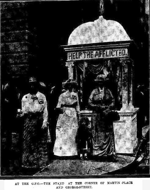 Circular Quay.-Watson's Bay steamers' jetty: Mrs.A. R. Cronin, £1) 7s 6d. Mosman and Cremorne steamers' jetty: Mrs. P. Leahy, £82 Ila lid. Manly steamers' jetty: Mrs. F. Waterston, £27 19s 1d, Neutral Bay steamers' jetty: Mrs. Struck and Miss Christie, £17 3s 2d. Milson's Point steamers' jetty: Mrs.E J Carver, £51 15s 1d. Parramatta River steamers' jetty: Miss A. E. Brighton. £22 6s 2d. Fire Brigade Station, George -street North.-Nurse Page, £17 8s 8d. Grosvenor-Square.-Grosvenor Hotel: Mrs M, Newton, £27 6s 2d. George and Bridge streets, north-east corner.-Mrs.S. W. Mackay, £7 4s lid. Customs-house, Alfred-street.-Mrs. A. J. Gray, £11 8s. Royal Exchange corner.-Miss Creal (Matron Sydney Hospital), £120 6s lOd. Hotel Metropole.-Mrs. John Kain, £40 4s 7d. George and Bridge streets, south-east corner.-Mrs. 0. Dclohcry. £40 Os 3d. Pitt and Hunter streets, "S. M. Herald" corner.Misses Ridge and Marr, £17 Os 4d. Bent and Macquarie streets, Australian Club corner. -Mrs. W. Mortimer, £20 5s 2d. Queen's Square.-Mrs. C. T. Hall, £38 7s 4d. Pitt and Moore streets, north-east corner.-Mrs.M. Dcery, £165 Os Id. Pitt and Hunter streets, south-west corner.-MissG. Cunningham, £22 10s Id. George-street.-Cale Français: Mrs. K. leard, £23 5s 4d. York and Jamieson streets.-Mrs. E, M. Boule, £32 7s 3d. Balmain Ferry Wharf.-Miss Darlington, -£10 Os lOd. Clarence-street.-Grand Central Hotel: Miss M. Dorman, £41 4s Od George-street.-Bank of New South Wales: Mrs. A.Norman, £10 18s 8d Martin-place, Challis House: Mrs. C. D. Paterson, £17 10s Id. George-street.-David Jones and Co.: Miss Morris(Matron United Dental Hospital), £12 Os 4d. George-Street and Martin-place, G.P.O. : Mrs. M, Ireland (Matron Children's Court). £20 18s. George-street and King-street.-Waters' comer; Miss M. Ncwill (Jfatron R.P.A. Hospital), £80 3s led.. Pitt and Rowe streets.-Mrs. W. J. Stelzer, £34 11s 10d Help The Afflicted – Photograph: TAKING TOLL. HOSPITAL SATURDAY COLLECTION. (1914, May 4).The Sydney Morning Herald (NSW : 1842 - 1954), p. 5. Retrieved from http://nla.gov.au/nla.news-article15505539 and OUTDOOR COLLECTION. (1914, May 4). The Sydney Morning Herald(NSW : 1842 - 1954), p. 5. Retrieved from http://nla.gov.au/nla.news-article15505536