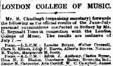 Sydney College of MusicThe following are the results of the annual examinations in connection with the Sydney College of Music, held in November last :