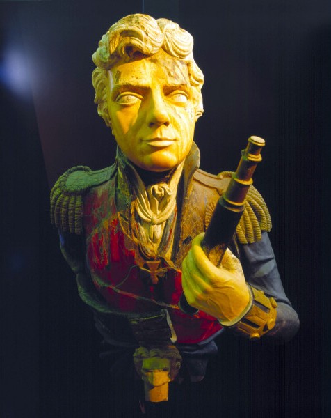 A figurehead is a carved wooden decoration found at the prow of ships largely made between the 16th and 19th centuries. Although they may not be a huge collectors item, they do feature anywhere there is a maritime heritage and do feature in museums that wish to impart some insights into vessels and their histories. The Figurehead Hall at Marinmuseum, Karlskrona Sweden, one of Sweden’s oldest museums, is a good example of one of these. Many of the figureheads displayed there were made by sculptor Törnström, royal sculptor to the navy, who worked at the Karlskrona shipyard during the 1700s. These include the figurehead of the ship the Dristigheten. This figurehead depicts a giant warrior with shield and short sword. Legend says that the figure was so badly wounded in Vyborg gauntlet that only the head could be saved, the restored version with a three crowns crest. (1.)