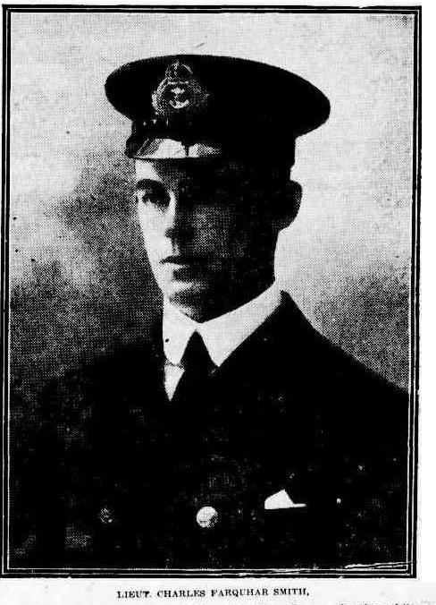 He was an officer Of the White Star liner Arabic, when at the beginning, of 1913 he joined the English navy, getting his lieutenancy prior to the war. When the battleships Aboukir, Hogue and Cressy were torpedoed at the Dardanelles Lt. Farquhar-Smith was aboard the former, and had the good fortune to be one of the 40 to survive.