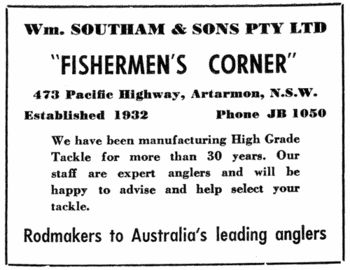 Fishing rods and reels are not only collectors items, they can, if well looked after, still be functional decades after first being purchased. In Australia the early split cane rods of tackle-maker Sydney-based William Southam Pty Ltd and J M Gillies of Melbourne were both well regarded. William "Bill" Southam began making cane rods in Sydney in the early 1930s, some of these taking up to 100 hours to make. By July 1948 William Southam had premises at 419 Pacific Highway, Artarmon, promoting themselves as 'Rodmakers to Australia's Leading Anglers' ("Outdoors & Fishing", January 1952, p185, advertisement to left).