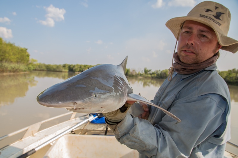 Researcher Peter Kyne with a Northern River Shark, photo by Michael Lawrence-Taylor