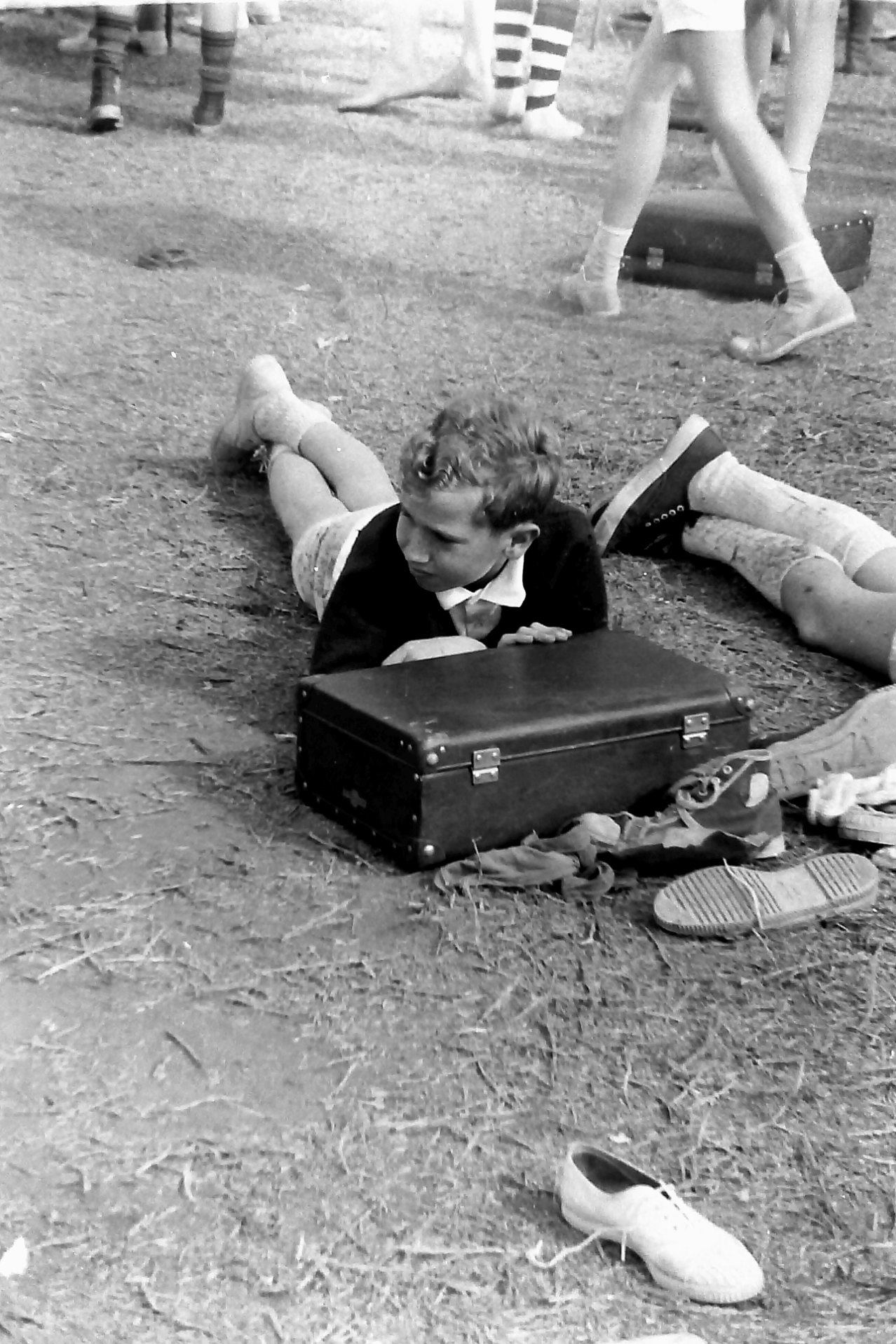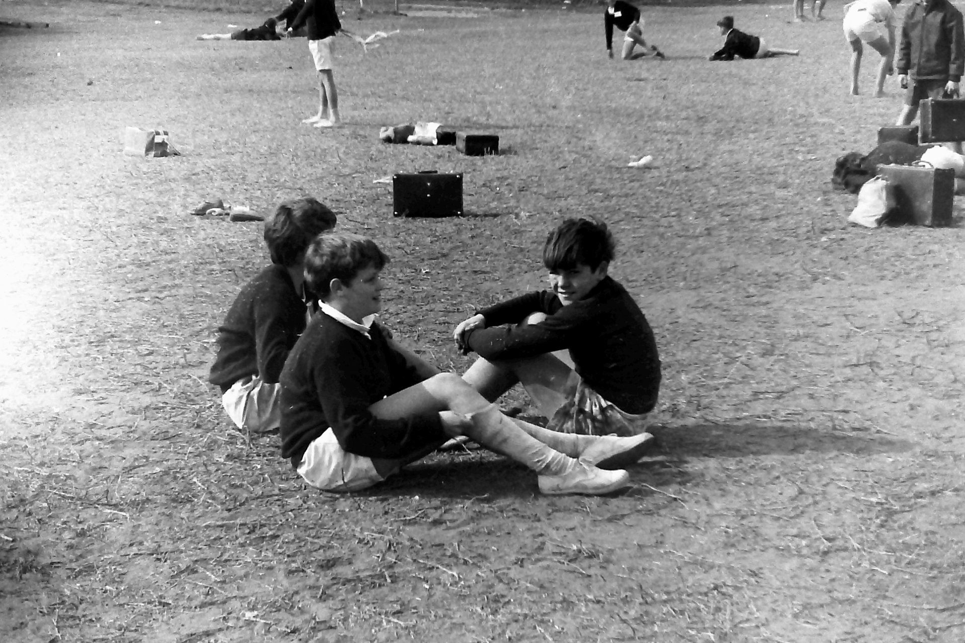 Between races, 1970 sports day, Dunbar Park. Note all the Globite school cases. No back-packs then.