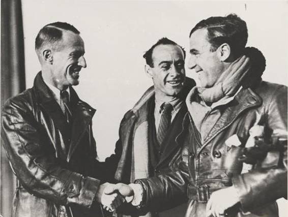 Below: George 'Scotty' Allan, in centre, watching Charles Kingsford-Smith, on left, shaking hands with James 'Jimmy' Mollison, ca. 1930, nla.pic-vn4925810