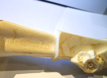 Today the factory he started, Egregia, in Volterra, a city of Italy in Tuscany, is still famous for its alabaster manufacture. Tuscan alabaster occurs in nodular masses embedded in limestone, interstratified with marls of Miocene and Pliocene age. The mineral is worked largely by means of underground galleries, in the district of Volterra. Several varieties are recognized—veined, spotted, clouded, agatiform, and others. The pieces that the factory produces, in recomposed stone, are made of alabaster, marble powder and resin. Many of these are the original models of the sculptures made by Cav. Arnaldo Giannelli and are produced in quantity, which does not mean they are cheap. Although some pieces retail for between $30-40.00 others fetch $200.00 and more.