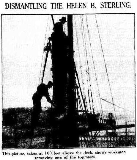 DISMANTLING THE HELEN B. STERLING. This picture, taken at 100 feet above the deck, shows workmen removing one of the topmasts. DISMANTLING THE HELEN B. STERLING. (1933, April 4). The Sydney Morning Herald (NSW : 1842 - 1954), p. 12. Retrieved from http://nla.gov.au/nla.news-article16963097