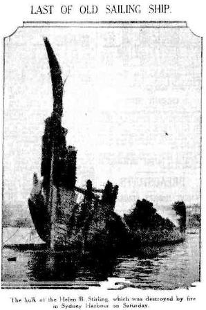 HELEN B. STIRLING. Arrives in Sydney. Memories of old sea dogs on the water-front yesterday were pleasantly revived when the graceful lines of the six-masted American schooner Helen B. Stirling came into view. Nowadays the entry of a sailer through the Heads excites quite a flutter among the older shipping fraternity, and the curiosity of the rising generation-they are strange visitors, becoming rarer every year or so. It Is three months since a salier, the Finnish barque Penang, entered the port of Sydney and revived memories of not so many years ago when rival tugs set out to search for her and bring her safely to port. The Helen B. Stirling is a vessel of 2500 tons. She brought nearly 3,000,000 feet of timber from Portland, Oregon, after a voyage occupying 78 days. Her skipper, Captain H. H. Oostrerhuis, is a veteran mariner, and holds confident views of the profitable working of sailing vessels. The vessel, he said, had a comfortable voyage across the Pacific. The Helen B. Stirling was towed into port by the St. Olaves to Double Bay, and later she was taken up to Snails Bay to discharge her cargo. HELEN B. STIRLING. (1930, March 28). The Sydney Morning Herald (NSW : 1842 - 1954), p. 11. Retrieved from http://nla.gov.au/nla.news-article16637511