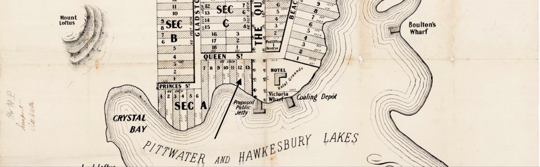 Lot twelve is described as the piece of land containing by admeasurement one rood twentyone and one-tenth perches or thereabouts situated at Newport in the Parish of Narrabeen, County of Cumberland and State of New South Wales being lot twelve of Section A of the Town of Newport commencing on the West side of Queen Street on the North East corner of lot thirteen and bounded thence on the East by that Street bearing Northerly sixty six feet to lot eleven thence on the North by that lot bearing Westerly two hundred and thirty two feet to the waters of the Pitt Water Bay thence on the North West by these waters bearing South Westerly to lot thirteen aforesaid and thence on the South by that lot bearing Easterly two hundred and sixty four feet to the point of commencement.