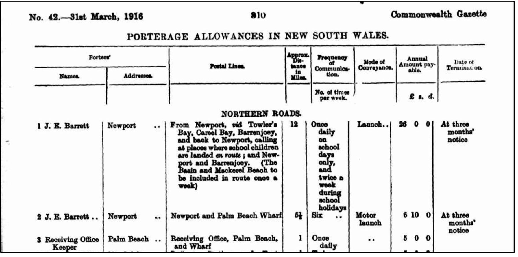 In 1916, John Ernest Barrett had a Government contract to provide ferry services for Pittwater. This included providing transport for children travelling to and from school, delivering mail and a regular run to Palm Beach Wharf. An extract from the contract reads as follows: