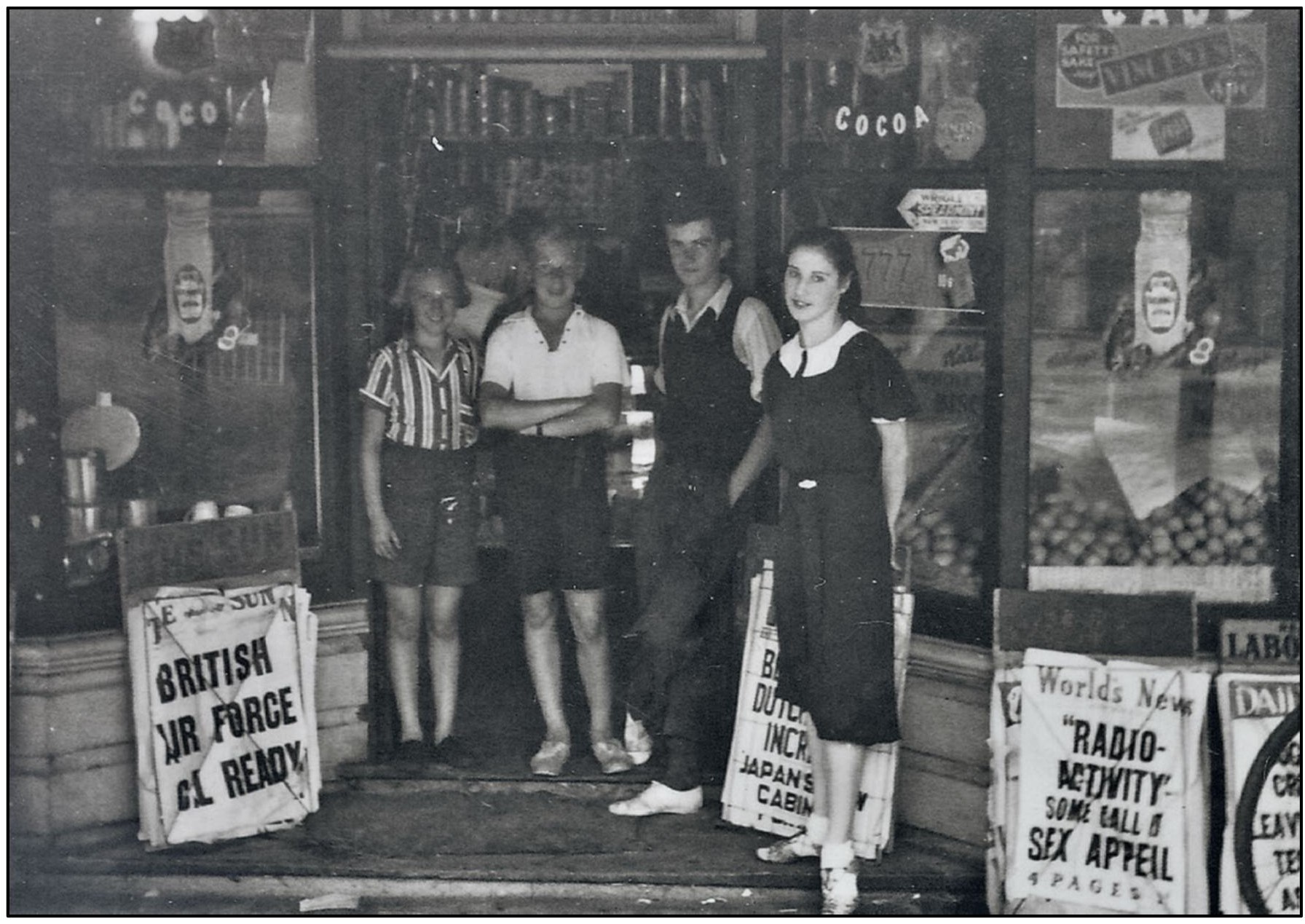 This was the store entrance in about 1943. The store became known as Campbell's Store, named after Charles Keith Campbell, who ran the business from October 9, 1941 and purchased the property on November 13, 1945. Young Elsie Illingsworth is standing on the left of the group of four. Photo supplied by Geoff Searl (Avalon Beach Historical Society) but originally from John Illingsworth