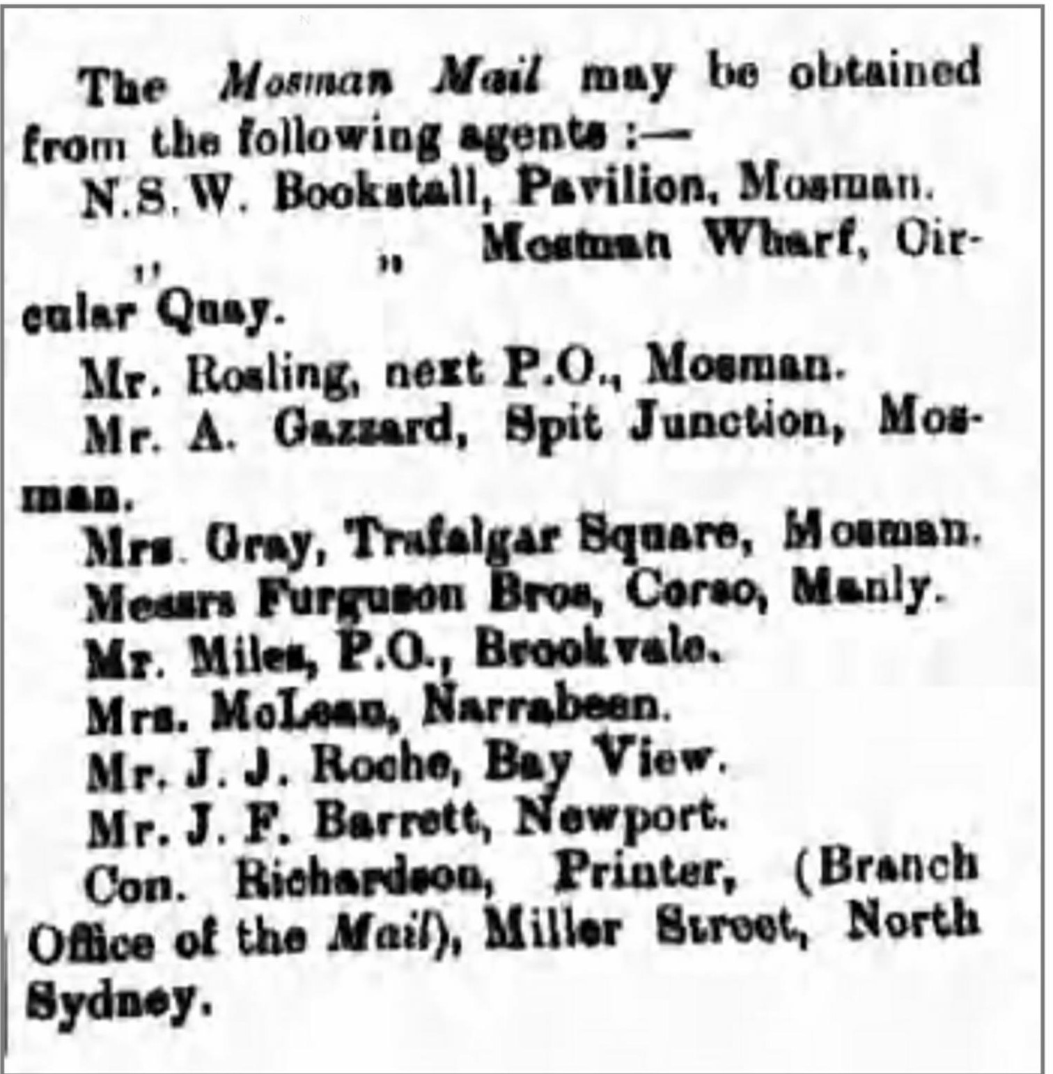 From as early as December 5, 1903, Barrett’s Store was a stockist of the ‘Mosman Mail’ Newspaper. At that time, he was the only advertised stockist north of Narrabeen.
